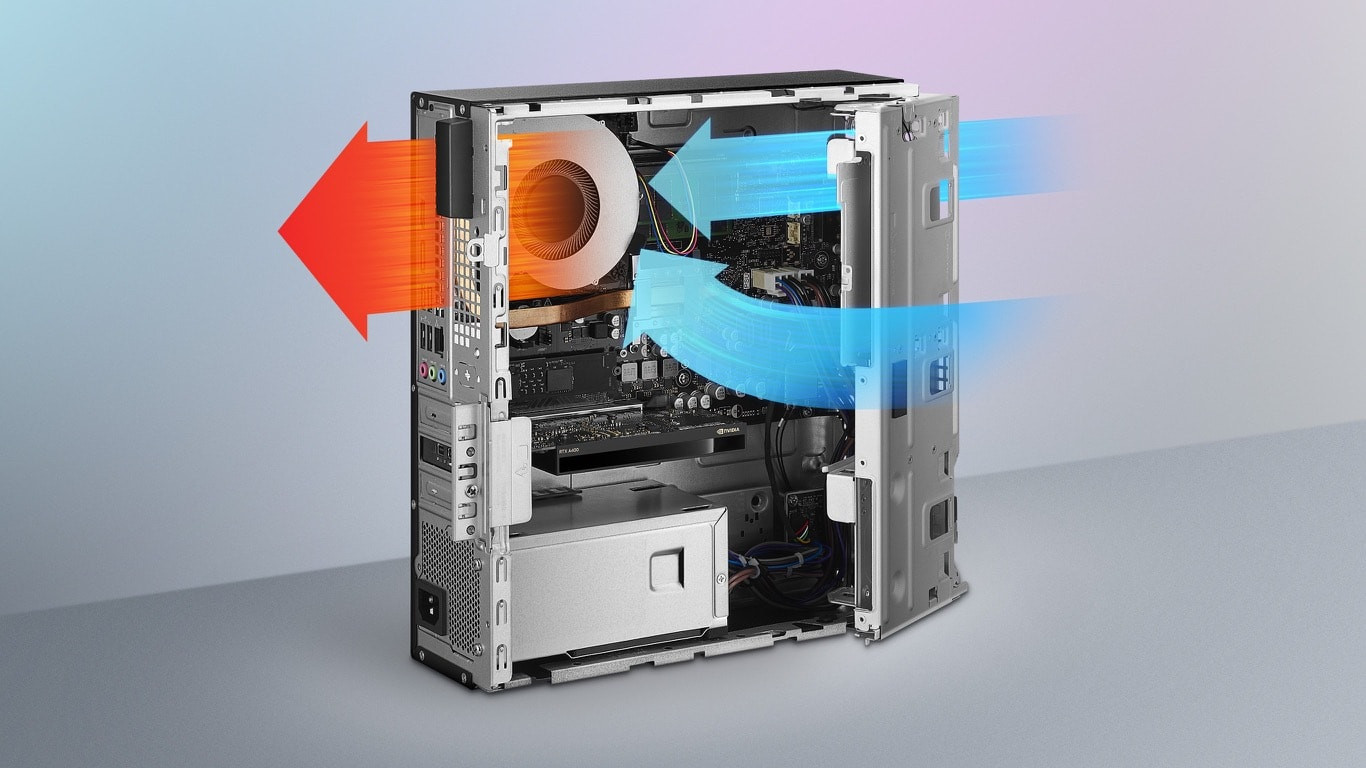 ASUS ExpertCenter P500 SFF je vybaven naším inovativním kompaktním vzduchovým chladičem pro výjimečnou regulaci teploty. Na rozdíl od tradičních věžových počítačů přidáváme měděnou tepelnou trubici pro rychlý odvod tepla od kritických komponent. Naše konstrukce navíc umisťuje vysoce účinný ventilátor vzadu, čímž vytváří optimalizovanou cestu proudění vzduchu, která nasává chladný vzduch zepředu a po stranách a zároveň odvádí teplo zezadu. Tato kombinace strategického proudění vzduchu a pokročilé technologie tepelných trubic zajišťuje optimální teploty i při náročných úkolech a poskytuje vysoký výkon bez kompromisů v kompaktním provedení.