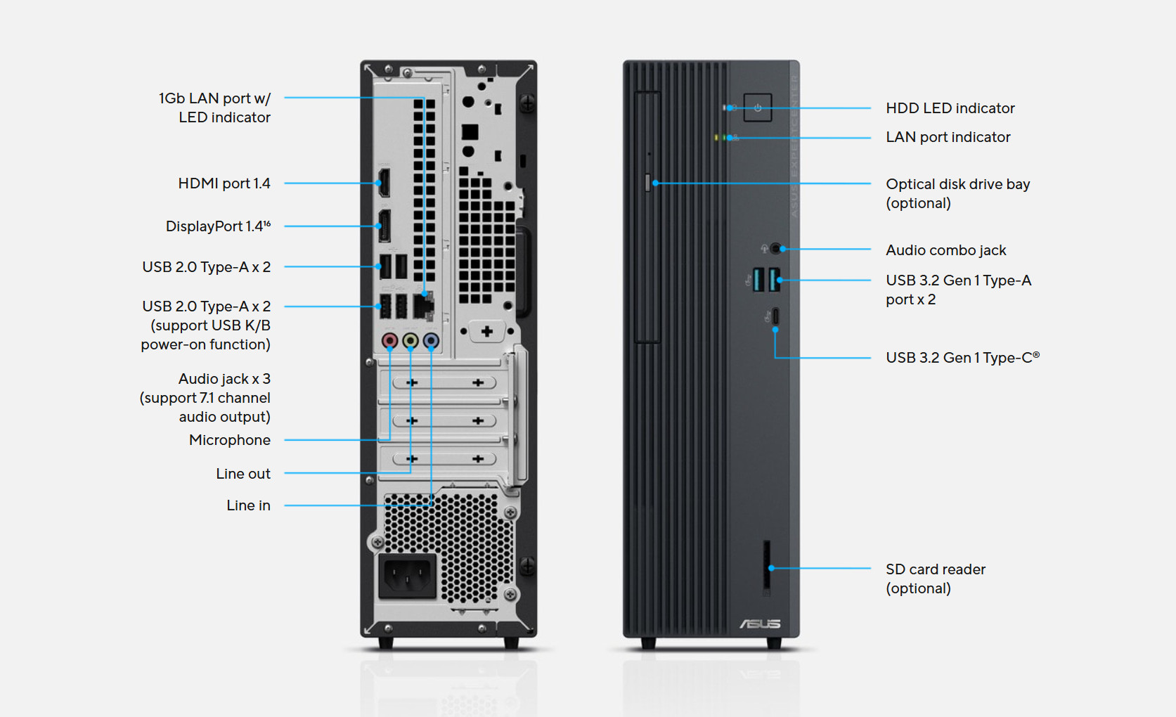 Kompletní řada I/O portů je připravena pro připojení ASUS ExpertCenter P500 SFF k široké škále firemních periferií. Má tři USB porty na přední straně pro rychlý a snadný přístup. Volitelnou čtečku SD karet pro snadné transakce, přenos dat nebo další obchodní úkoly.