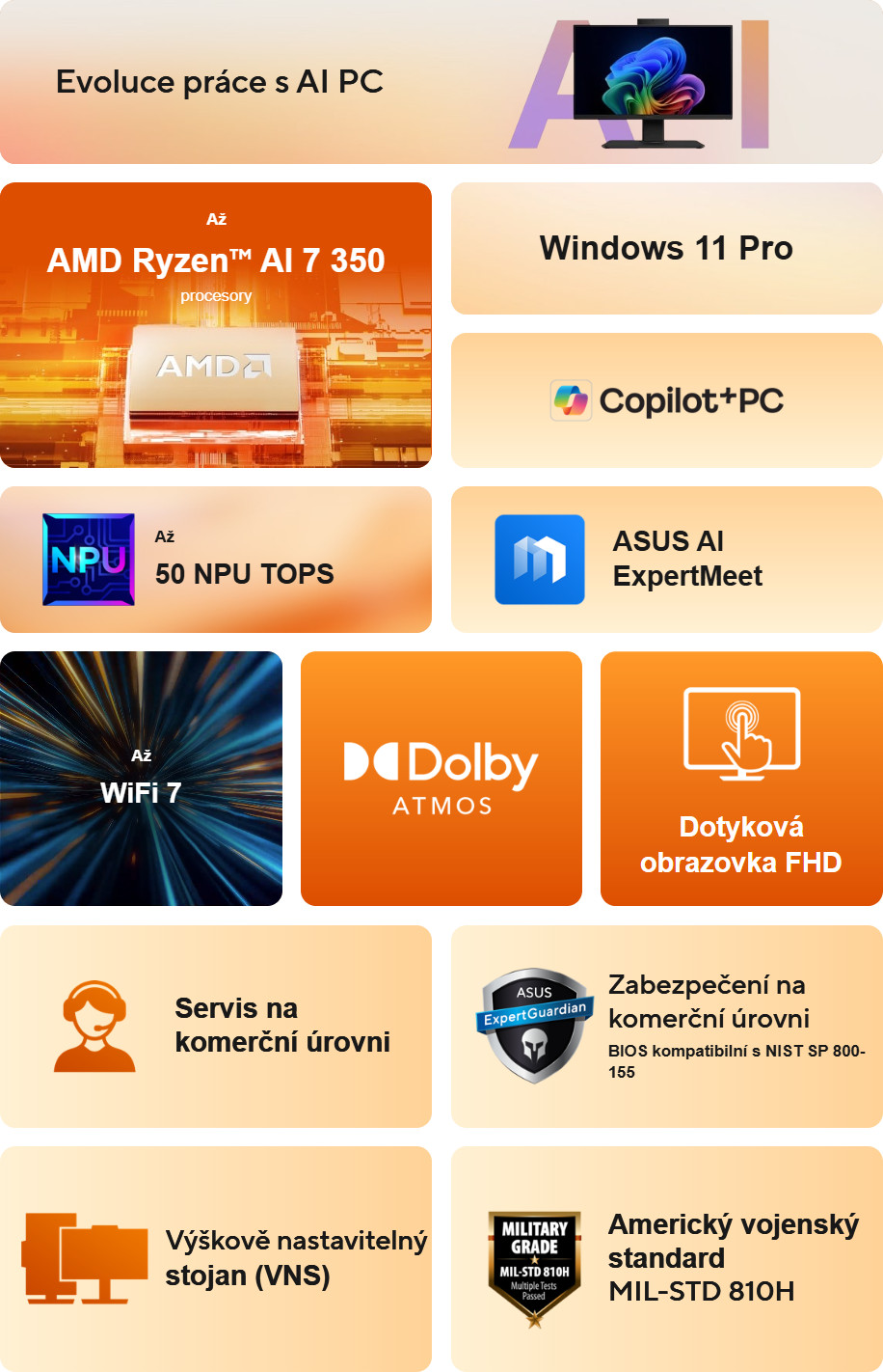 ASUS ExpertCenter P600 AiO přináší výkon na nové úrovni založený na umělé inteligenci pro potřeby moderního podnikání. Jako první počítač ASUS All-in-One Copilot+1 je vybaven procesorem až AMD Ryzen™ AI 7, který bez námahy zvládá náročné úlohy využívající umělou inteligenci a zvyšuje produktivitu. 24palcová širokoúhlá dotyková obrazovka FHD2 nabízí úchvatný vizuální zážitek, zatímco výsuvná kamera zajišťuje soukromí díky elegantnímu designu. Systém BIOS kompatibilní se standardem NIST SP 800-15 a volitelný čip TPM 2.03 poskytují počítači ASUS ExpertCenter P600 AiO robustní zabezpečení, které ochrání vaše firemní data.