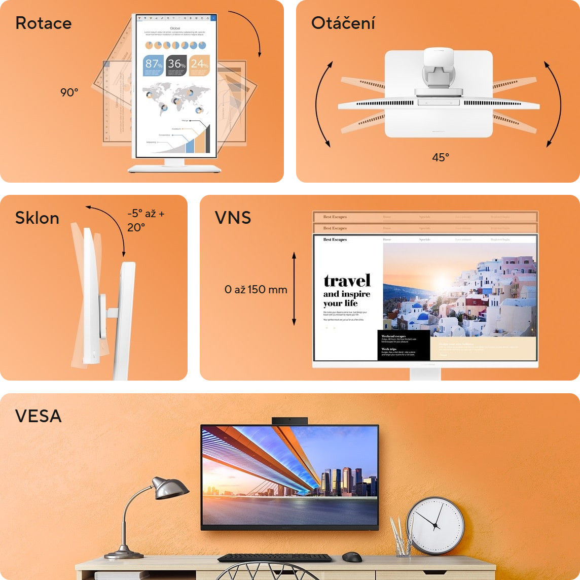 ASUS ExpertCenter P600 AiO nabízí volitelný výškově nastavitelný stojan (VNS), který umožňuje naklonění, natočení a nastavení výšky pro nejpohodlnější polohu pro sledování, ať už sedíte, nebo stojíte. Podporuje také orientaci na výšku i na šířku, takže je ideální pro videohovory a multitasking. Pro ještě větší všestrannost umožňuje design kompatibilní se standardem VESA snadnou montáž na stěnu, aby vyhovoval každému pracovnímu prostoru.