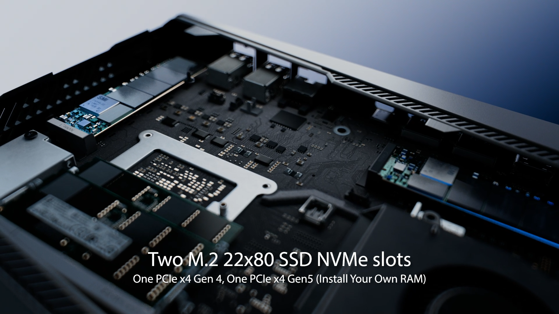 ROG GR70 je vybaven mechanismem ROG Q-latch pro snadnou instalaci modulů M.2. Stačí otočit Q-latch proti směru hodinových ručiček a modul je na svém místě. Podporovány jsou až dva disky M.2 SSD, které umožňují rychlé spuštění systému a aplikací.