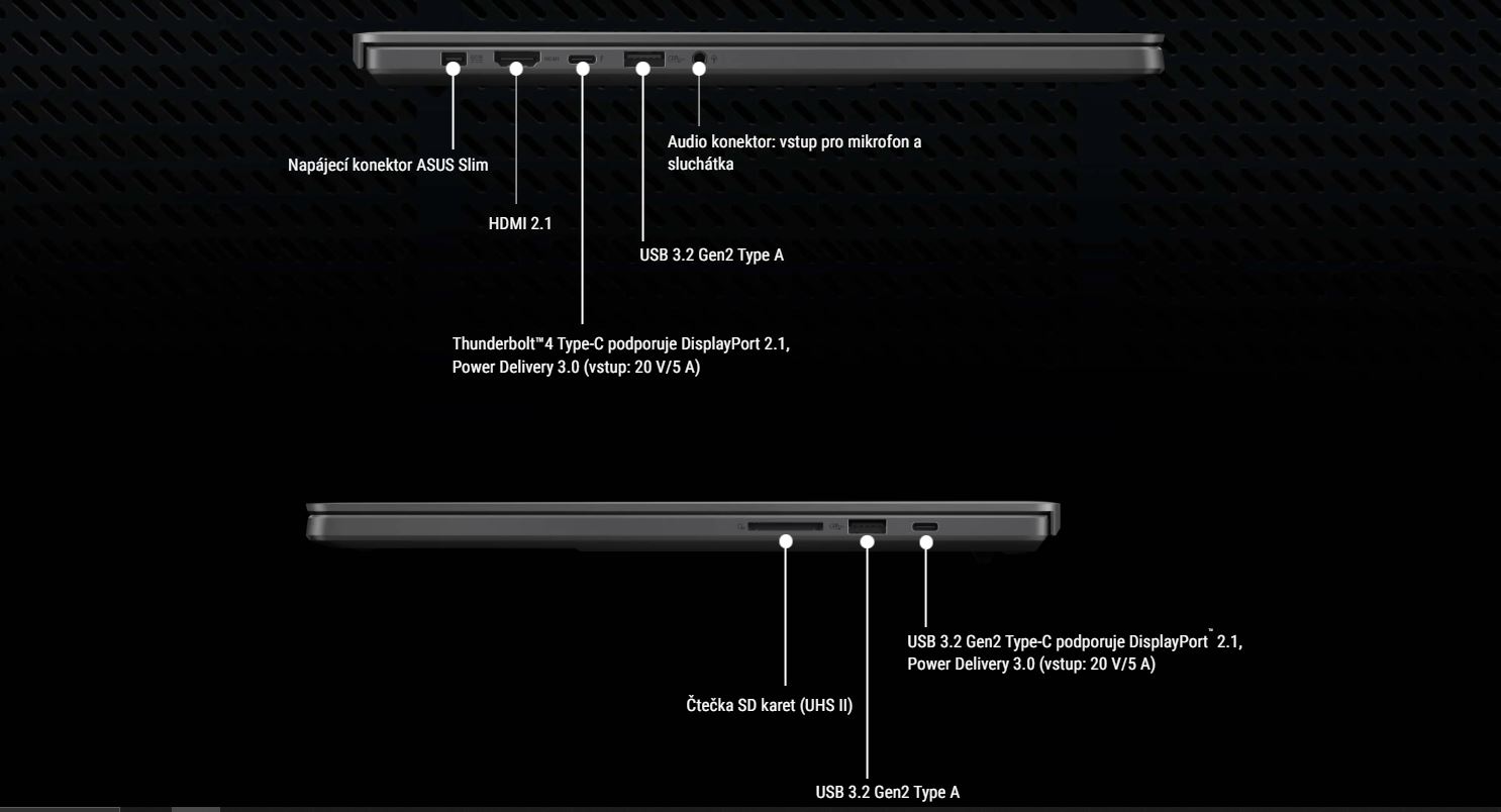 Navzdory svému štíhlému a mimořádně přenosnému tělu nabízí G16 kompletní možnosti připojení, což vám umožní pracovat nebo vytvořit bojovou stanici vašich snů. Dva porty USB-C, oba podporující výstup pro monitor, a jeden s podporou ThunderboltTM 4 a DisplayPort 2.1 využívají tento všestranný konektor na maximum. Pro vaše další periferní zařízení jsou k dispozici dva porty USB 3.2 Gen2 Type-A, které ještě více rozšiřují možnosti připojení. Pro rychlý přenos souborů nebo další úložiště je připravena speciální čtečka karet SD UHS-II.