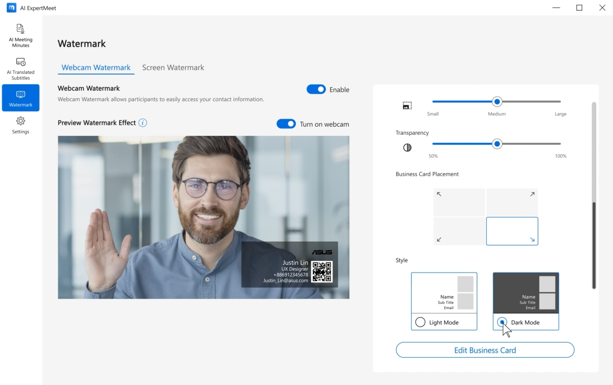 Představujeme ASUS AI ExpertMeet, asistenta s umělou inteligencí, který zlepšuje zážitky ze schůzek. Optimalizujte pohlcující konferenční zážitky pomocí technologie AI Noise-Canceling potlačení šumu pomocí umělé inteligence a pomocí kamery s umělou inteligencí. Zachyťte všechny důležité okamžiky pomocí funkce AI Meeting Minutes, která shrnuje a překládá schůzky. Zaměřte se na nápady, ne na obavy o soukromí. Nechte asistenta ASUS AI ExpertMeet posílit skvělou spolupráci.