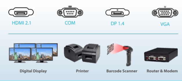 ExpterCenter PN53 je dobře vybaven pro širokou škálu funkcí a lze jej použít pro digitální informační tabule, pokladní systémy nebo inteligentní prodejní automaty. Pro monitory nebo starší zařízení, jako jsou skenery čárových kódů nebo tiskárny účtenek, lze zadat konfigurovatelný port HDMI, VGA, DisplayPort nebo COM.