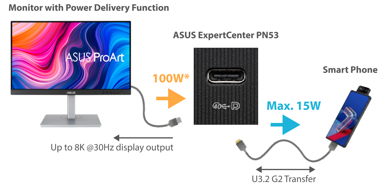 Vstup PD umožňuje monitoru napájet zařízení ExpertCenter PN53 prostřednictvím jediného kabelu USB-C, což umožňuje vytvořit přehlednější pracovní stanici. ExpertCenter PN53 dokáže prostřednictvím tohoto připojení přijímat napájení a dodávat signál DisplayPort a také napájet mobilní zařízení.