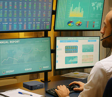 ASUS ExpertCenter PN54-S1 je vybaven procesory AMD Ryzen™ řady 200 s až osmi výkonnými jádry a efektivně zvládá vše od multitaskingu přes provoz digitálních reklamních tabulí až po nenáročné úlohy využívající AI.