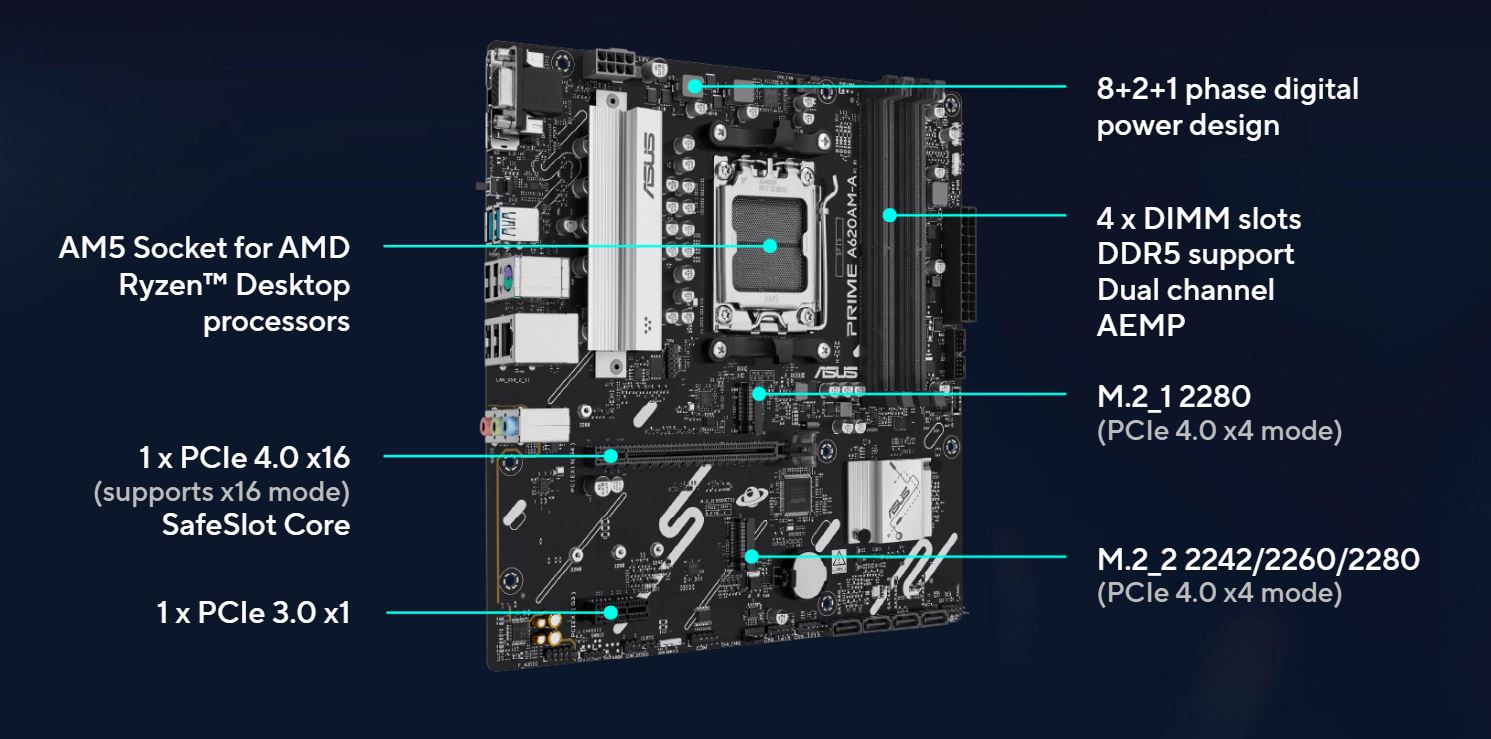 Komplexní možnosti ladění paměti jsou základním kamenem základních desek PRIME. PRIME A620AM-A-CSM maximalizuje potenciál vašich modulů DDR5, od základních až po extrémně rychlé sady. U základních modulů bez podpory EXPO™ funkce ASUS Enhanced Memory Profile (AEMP) automaticky detekuje paměťové čipy a poskytuje optimalizované profily pro vylepšený výkon. Pro ty, kteří chtějí překonat standardní rychlosti DDR5, nabízí PRIME A620AM-A-CSM rozsáhlou podporu AMD Extended Profiles for Overclocking (EXPO™) a širokou škálu nastavení UEFI pro další vylepšení výkonu.