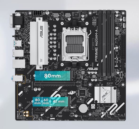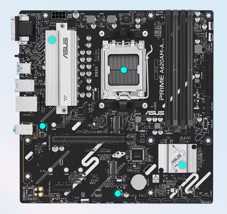 Základní deska PRIME A620AM-A-CSM je vybavena několika integrovanými chladiči a řadou hybridních konektorů pro ventilátory, které zajišťují chlazení a stabilitu vašeho zařízení i při intenzivním zatížení.