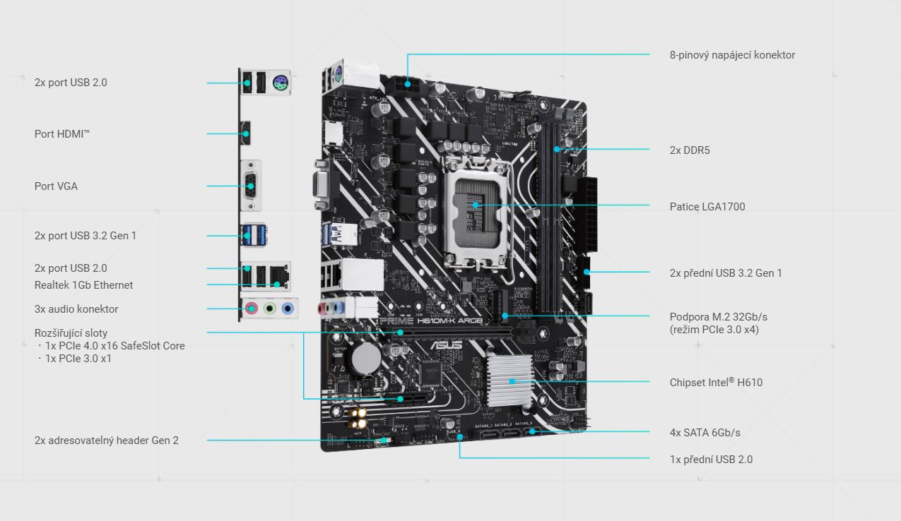 Základní desky Prime H610 jsou navrženy speciálně pro procesory Intel® Core™ 13. a 12. generace a nabízejí připojení PCIe 4.0 pro grafické karty. Velká šířka pásma a vysoké přenosové rychlosti vám umožňují stavět funkčně bohaté sestavy, které bez problémů zvládnou vysoké zatížení. Četné porty USB podporují špičkové sestavy s mnoha připojenými periferiemi, včetně čtyř konektorů USB Type-A na zadním panelu s rychlým připojením USB 3.2 Gen 1 pro kompatibilní skříně.