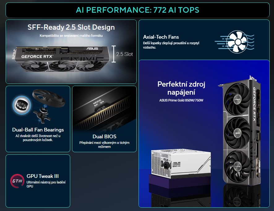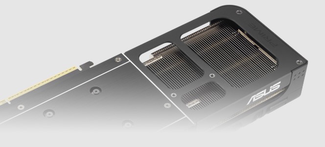 Prime RTX 5060 Ti má 2,5 slotový design s pečlivě uspořádaným rozložením krytu, chladiče a tepelných trubic, aby tři ventilátory Axial-tech mohly využít ventilaci bočního panelu šasi a zajistit optimální tepelný výkon.