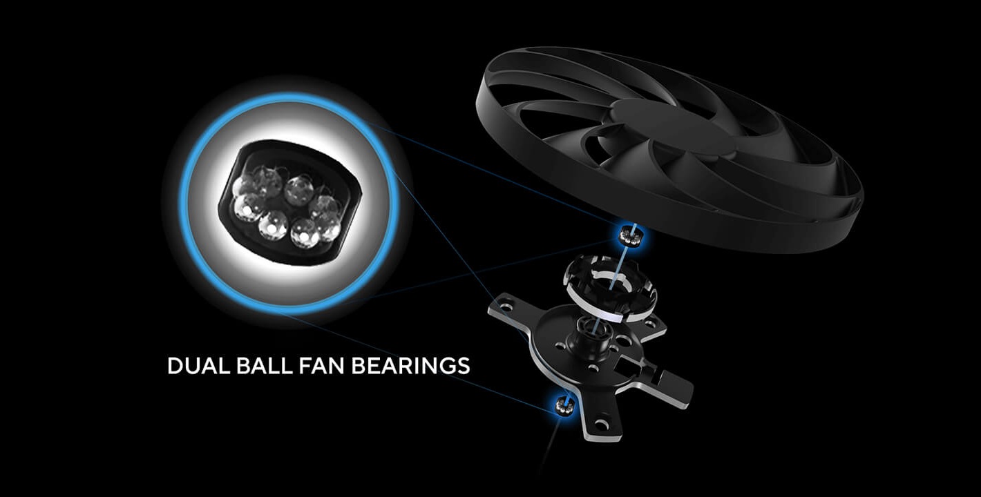 Tři osvědčené ventilátory Axial-tech mají menší náboj, který usnadňuje použití delších lopatek, a bariérový kroužek, jenž stlačuje vzduch směrem dolů, což znamená nižší teploty, méně hluku a vyšší výkon.