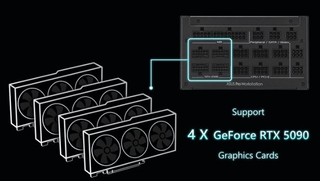 Napájecí zdroj ASUS Pro WS 3000W Platinum je navržen pro podporu až čtyř grafických karet GeForce RTX™ 5090. Disponuje také certifikací 80 PLUS Platinum, vysoce výkonnými měděnými piny, dvojitými kuličkovými ložisky ventilátoru, leptanými kabely, spolehlivou stabilitou napětí a pokročilým napájením, což z něj činí ideální volbu pro řešení umělé inteligence, hluboké učení a správu IT.