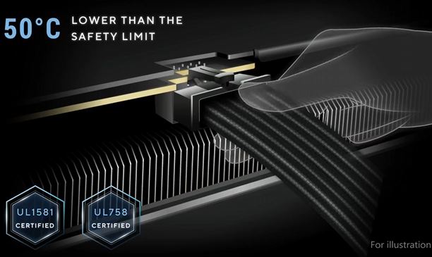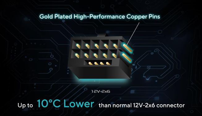 Měděné piny konektorů PCIe® v tomto zdroji byly vylepšeny zlatem, aby se zajistilo lepší chlazení a vyšší účinnost napájení. Toto pokovení se promítá do výrazného snížení běžných teplot konektorů 12V-2x6 (až o 10 °C), což podporuje optimální výkon a stabilitu i pro ty nejnáročnější grafické karty. Vylepšený kontakt mezi piny patice a konektory navíc snižuje odpor a zvyšuje odolnost při zasouvání a vyjímání konektorů, čímž zajišťuje spolehlivé chlazení.