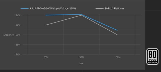 ASUS Pro WS Platinum využívá japonské kondenzátory serverové třídy s nízkým ESR pro zajištění efektivního provozu. Toto vylepšení umožňuje certifikaci 80 PLUS Platinum, která zaručuje 89% účinnost při 100% zátěži a 92% účinnost při 50% zátěži. Tato zvýšená účinnost má za následek menší zahřívání, snížený hluk ventilátoru a zvýšenou spolehlivost.