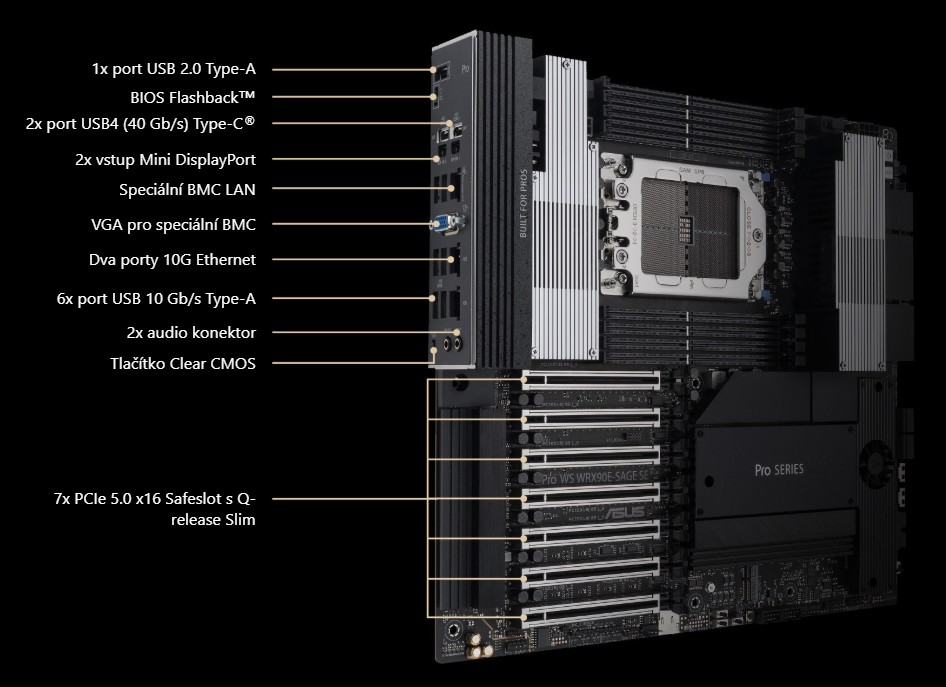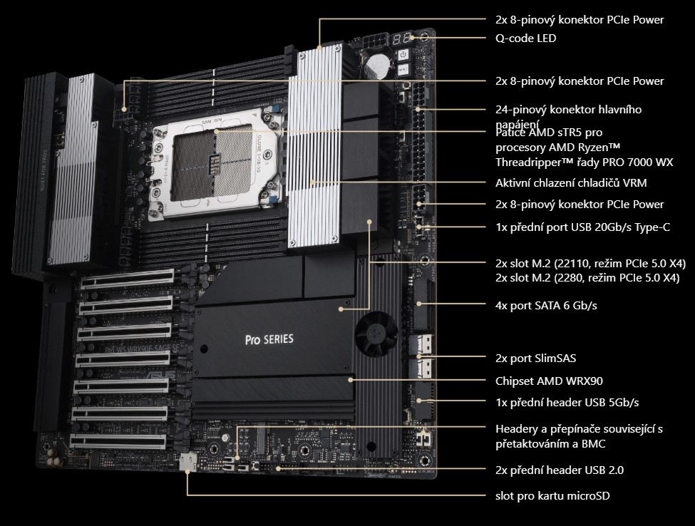 Díky integrovaným napájecím konektorům PCIe, které nabízejí dodatečnou podporu pro více grafických karet, aktivnímu chlazení na chladičích VRM, portům USB 40 Gb/s, SlimSAS a a integrovanému BMC, je základní deska Pro WS WRX90E-SAGE SE připravena na celou řadu scénářů a odvětví.