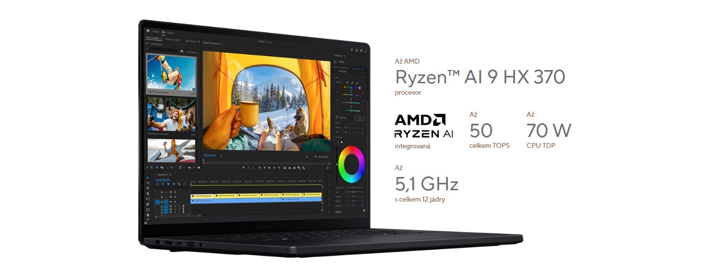 Vstupte do budoucnosti tvorby obsahu s pomocí procesoru AMD Ryzen™ AI 9 HX 370. Má 50 TOPS NPU výpočetního výkonu a přináší efektivitu vylepšenou AI. Díky dominantnímu jednojádrovému i vícejádrovému výkonu je import a renderování náročných záběrů v rozlišení 4K hračkou. NPU využívající Ryzen AI urychluje úlohy řízené AI v aplikaci Adobe Premiere Pro a zefektivňuje procesy, jako je převod řeči na text, automatické rámování sekvencí a detekce střihu scény. Zaměřte se na vyprávění příběhů, ne na workflow.