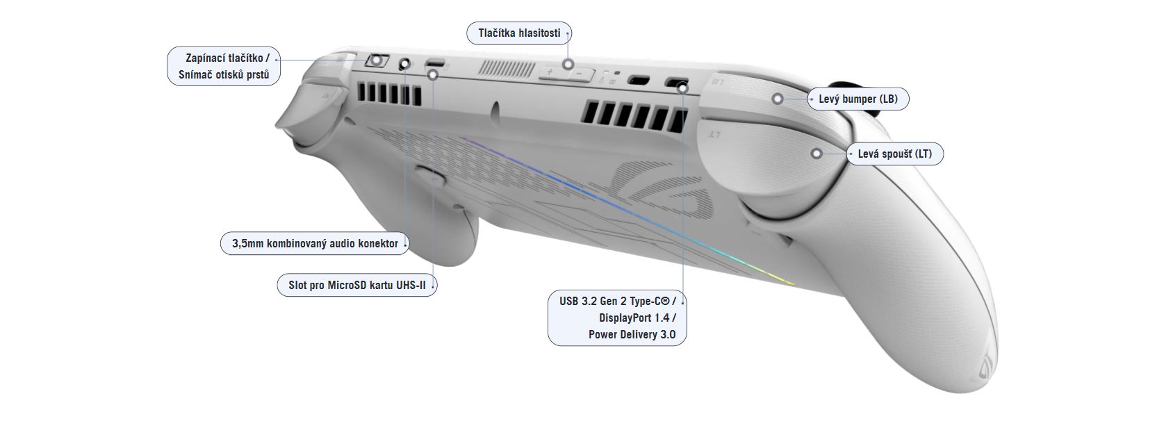 Na pouzdře je mikrotiskem vytištěn text ROG a Xbox, zatímco logo ROG "Fearless Eye" je vyraženo na rukojeti a vyleptáno na přívodu vzduchu vzadu. Ať se podíváte kamkoli, ROG a Xbox se hrdě a hlasitě hlásí k tomuto zařízení.