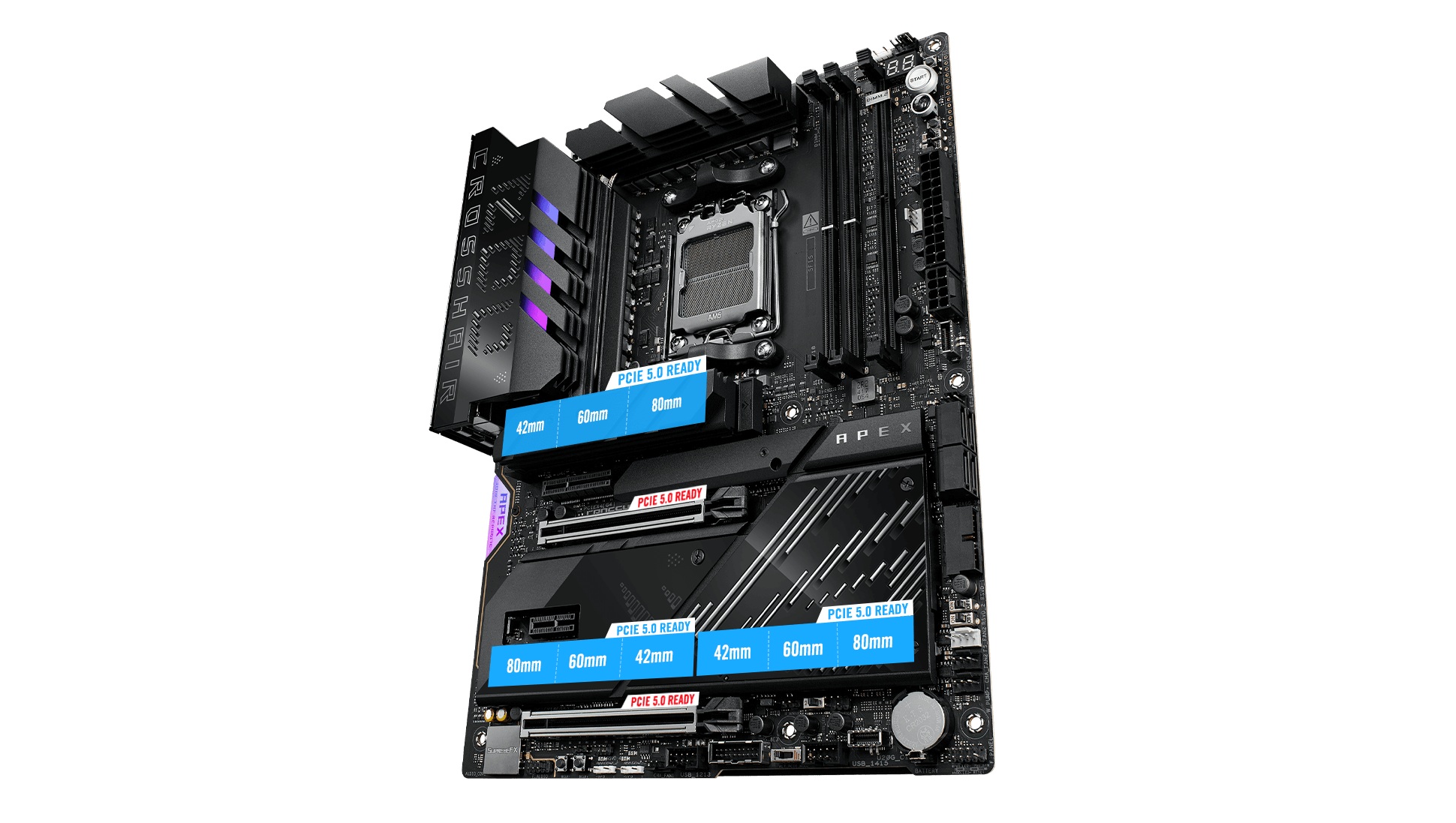 ROG Crosshair X870E Apex je vybaven třemi integrovanými sloty PCIe 5.0 M.2, které nabízejí bleskovou rychlost 16 GB/s.