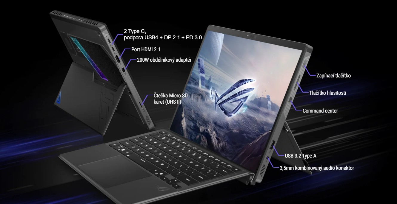 Navzdory tenkému profilu je Flow Z13 schopen vytvořit z vaší sestavy opravdovou bojovou základnu. Dva porty USB Type-C s podporou USB4, obrazový výstup DisplayPort 2.1 a napájení Power Delivery 3.0 umožňují bezproblémové připojení k celé řadě monitorů a periferních zařízení. Z13 je také vybaven klávesou Command Center, jedním portem USB-A, HDMI 2.1, čtečkou Micro SD karet a audio konektorem. Díky těmto speciálním vstupním a výstupním portům je Flow Z13 jediným tabletem, který vám opravdu umožní zcela zapomenout na dongly.