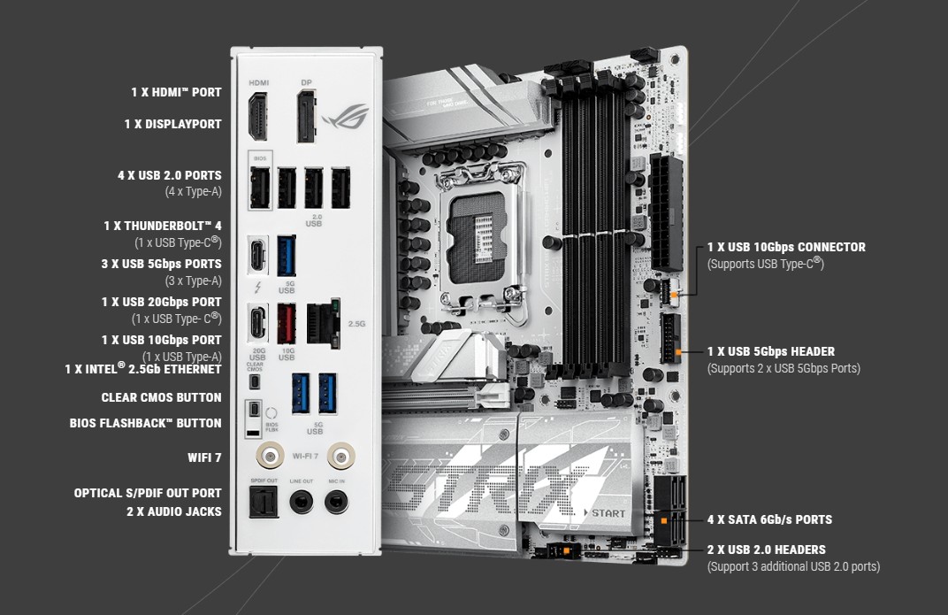 ROG Strix B860-G je vybaven rozhraním Thunderbolt™ 4, PCIe 5.0 a osvětlením Aura Sync a nabízí bleskurychlé datové přenosy, vynikající konektivitu a flexibilní estetický vzhled, který se přizpůsobí odvážným i decentním preferencím. Je navržen tak, aby splňoval požadavky elitních her a pokročilých aplikací pro počítače s umělou inteligencí, a poskytuje výkon a rychlost, které potřebujete.