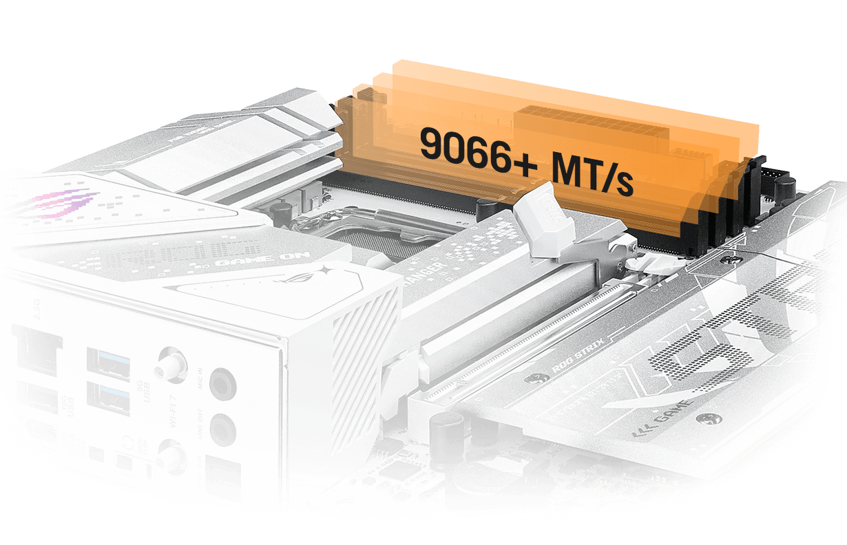 Společnost ROG má bohatou historii poskytování špičkového výkonu pamětí a DDR5 není výjimkou. Vylepšené směrování signálu může u modelu Strix B860-G posunout sady pro nadšence daleko za hranici 9 GT/s, přičemž na obzoru jsou ještě vyšší rychlosti. Zkušeným uživatelům nabízí UEFI širokou škálu možností, jak vyladit a posunout výkon až na hranice možností.