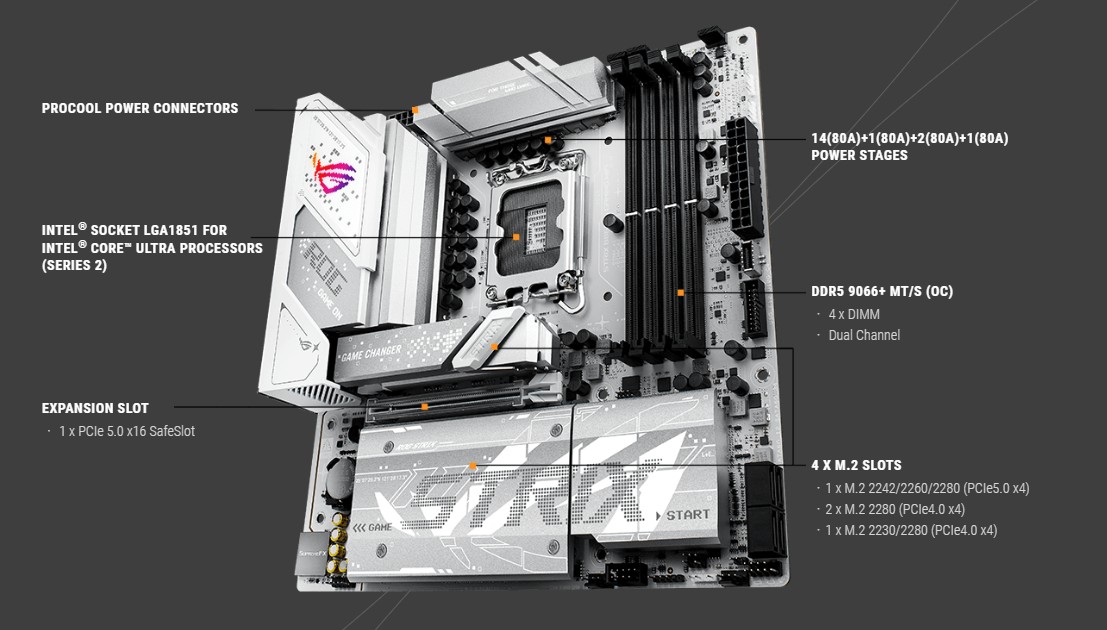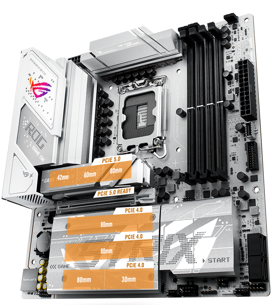 Strix B860-G nabízí podporu rozhraní PCIe 5.0 end-to-end a nejvyšší rozšiřující slot x16 je chráněn držákem SafeSlot, který unese hmotnost nejnovějších grafických karet. Jeden z vestavěných slotů M.2 je dimenzován na bleskové rychlosti čtení a zápisu až 16 GB/s, zatímco zbývající mohou poskytovat stále působivých 8 GB/s přenosů. A každý slot M.2 je pokrytý výraznými chladiči, které odvádějí teplo disků nové generace.