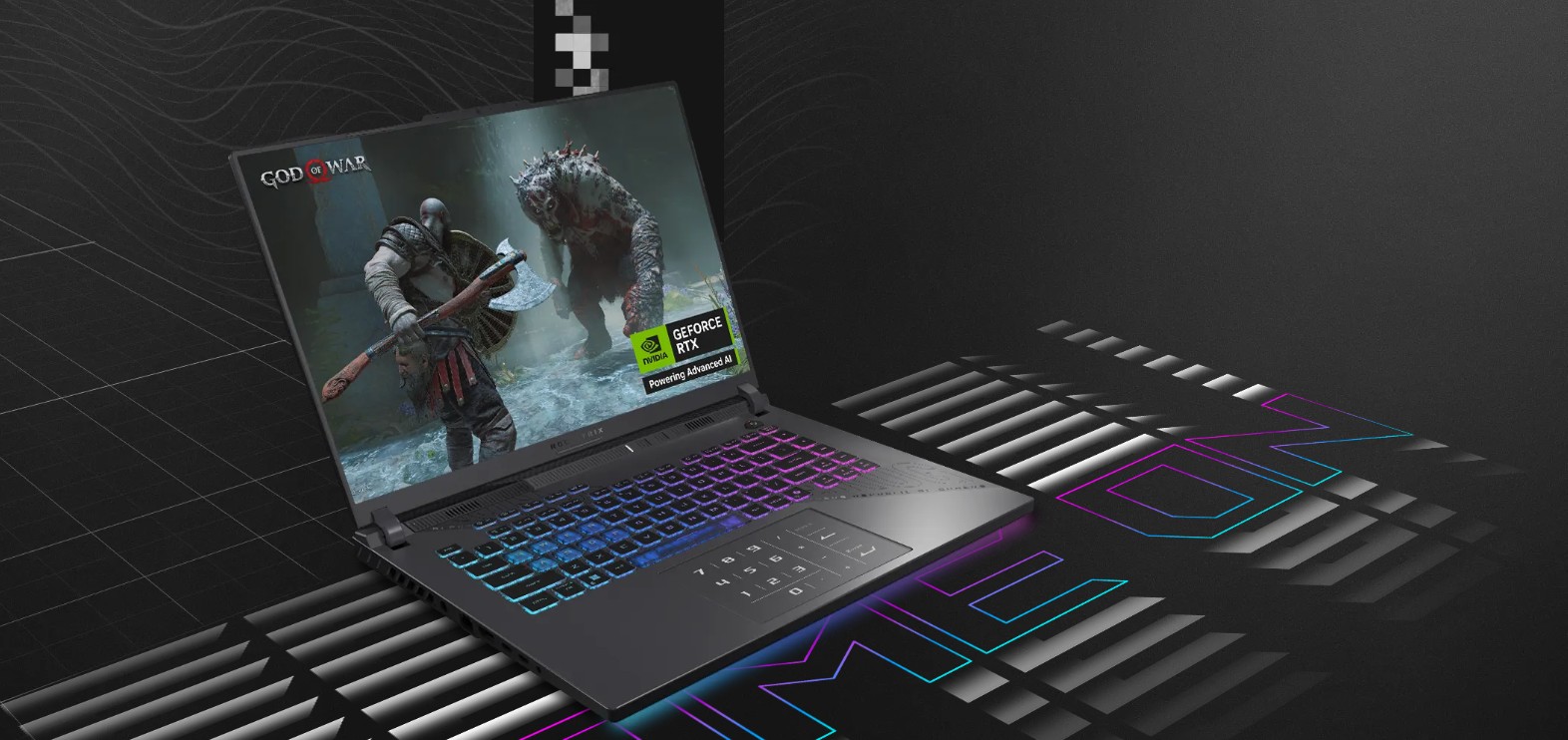 Pixelartové akcenty notebooku Strix G16 dodávají šasi více elegance. I tak pořád na dálku snadno poznáte, že jde o ROG stroj.