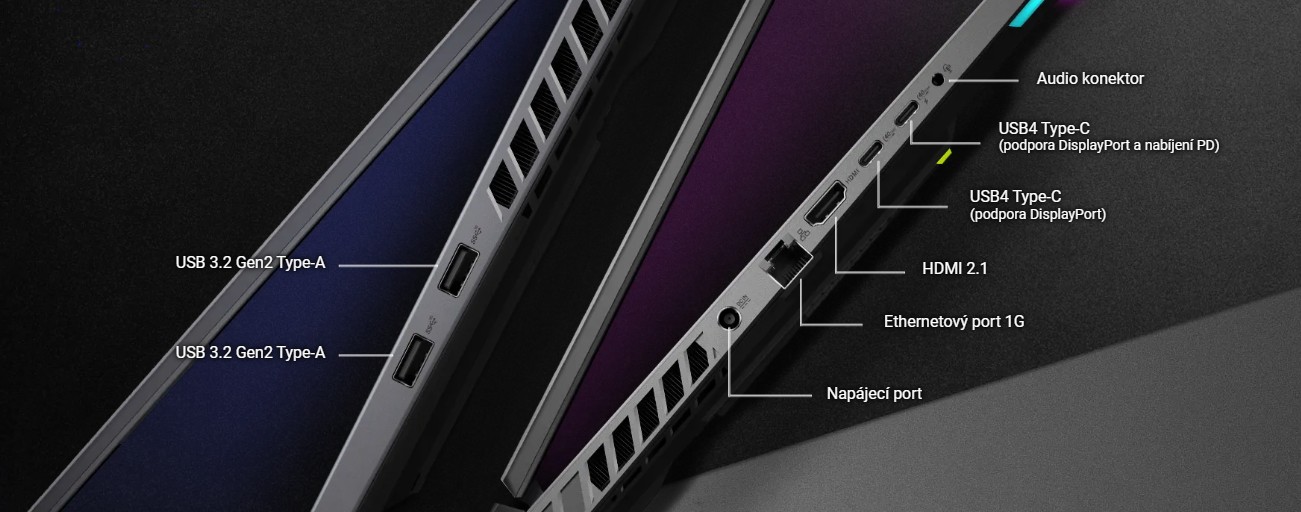 Když se potřebujete připojit k větší obrazovce, samostatná grafická karta podporuje port HDMI 2.1 určený pro nejnovější televizory a monitory. Tento port zvyšuje celkovou šířku pásma z 18 na 48 Gb/s a podporuje přehrávání až 4K obsahu při 120 Hz a 8K obsahu při 60 Hz. Dva porty USB4 Type-C nabízejí dostatek možností připojení - pro DisplayPort a jeden pro nabíjení power delivery.