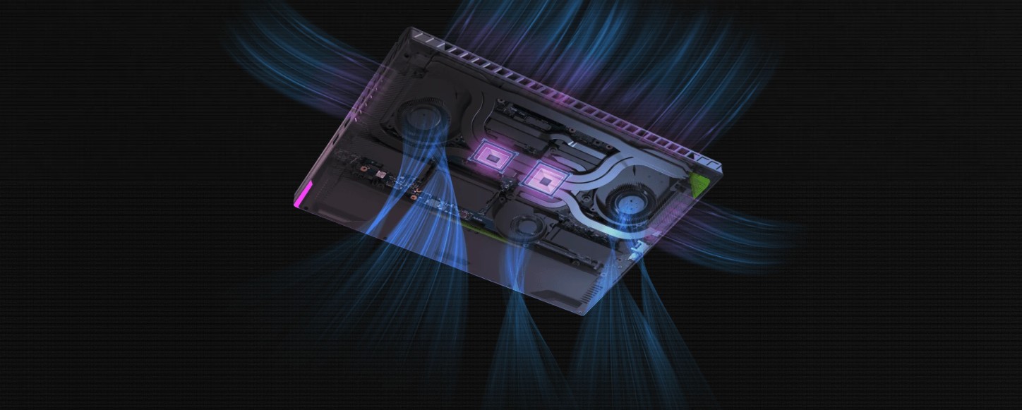 Aby bylo možné využít tak výkonné komponenty, byly šasi i základní deska v notebooku Strix G16 navrženy tak, aby se do nich vešel náš chladič přes celou šířku. Jeho žebra byla posunuta ještě blíže k ventilačním otvorům, aby bylo chlazení účinnější. Tento chladič přes celou šířku notebooku je sestaven ze tří různých částí, které obklopují základní desku hustě uspořádanými žebry s celkovou plochou 174 183 mm2*. Toto řešení maximalizuje dostupné cesty pro únik horkého vzduchu ze stroje a výrazně zvyšuje celkové proudění vzduchu.