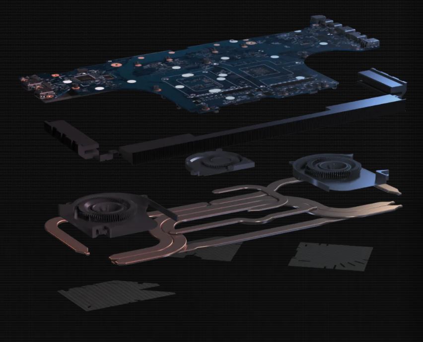 Tepelnou energii odvádějí tři chladiče, z nichž každý lemují měděná žebra tenká pouze 0,12 mm. Tato žebra jsou o polovinu menší než u běžných řešení. To umožňuje jejich vyšší hustotu zaručující lepší odvod tepla a také nižší odpor vzduchu s plynulejším průtokem. Díky až 412 žebrům na chladiči s celkovou plochou 187 156 mm2 proudí teplo ze systému neuvěřitelně efektivně, což umožňuje komponentám v notebooku nárůst výkonu po delší dobu.