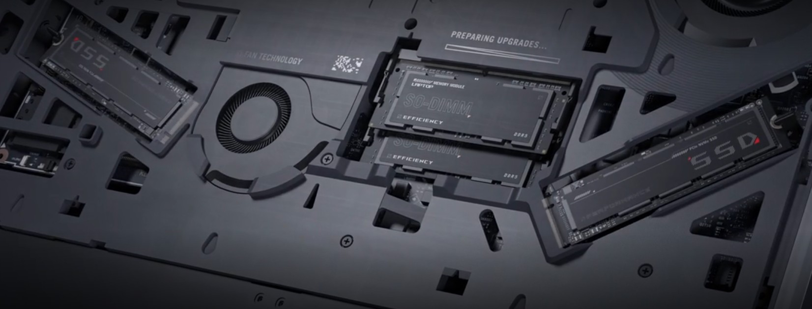 Zcela jsme přepracovali konstrukci notebooku 2025 Strix G18, aby byly upgrady jednodušší než dříve. Toto řešení nevyžaduje nářadí a umožňuje snadný přístup k paměti RAM, SSD i ventilátorům. Z toho důvodu jsme také použili náš nejnovější systém Q-latch pro přístup k SSD slotům. Podobně jako zkušená posádka v boxu zvládnete i vy vyměnit SSD a RAM během několika sekund a stroj opět zprovoznit, aniž byste vynechali jediné závodní kolo. Speciálně navržený rámeček zakrývá zbytek základní desky, aby ochránil ostatní komponenty. Uživatelé, kteří si vše chtějí upravovat podle svého, ho ale mohou jednoduše sejmout pomocí několika šroubů.