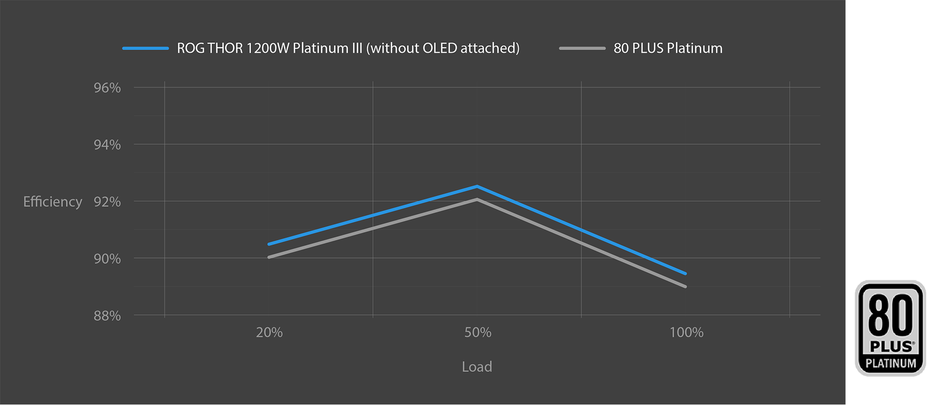 ROG Thor 1200W Platinum III využívá japonské kondenzátory s nízkým ESR pro zajištění efektivního provozu. Tyto vylepšení umožňují certifikaci 80 PLUS Platinum, která zaručuje účinnost 89 % při 100% zatížení a 92 % při 50% zatížení. Vyšší účinnost vede k menšímu zahřívání, snížení hlučnosti ventilátoru a vyšší spolehlivosti.
