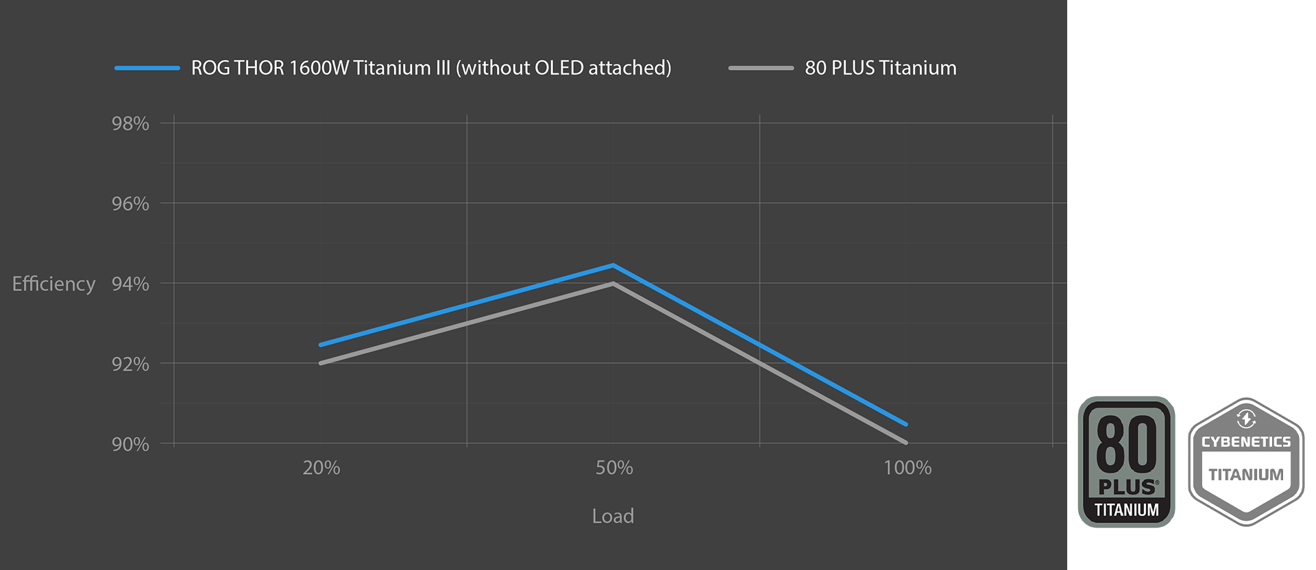 ROG Thor 1600W Titanium III využívá japonské kondenzátory s nízkým ESR, které zajišťují efektivní provoz. Tyto vylepšení umožňují certifikaci 80 PLUS Titanium, která zaručuje 90% účinnost při 100% zatížení a 94% účinnost při 50% zatížení. Získává také certifikaci účinnosti Cybenetics Titanium. Vyšší účinnost vede k menšímu zahřívání, snížení hlučnosti ventilátoru a vyšší spolehlivosti.