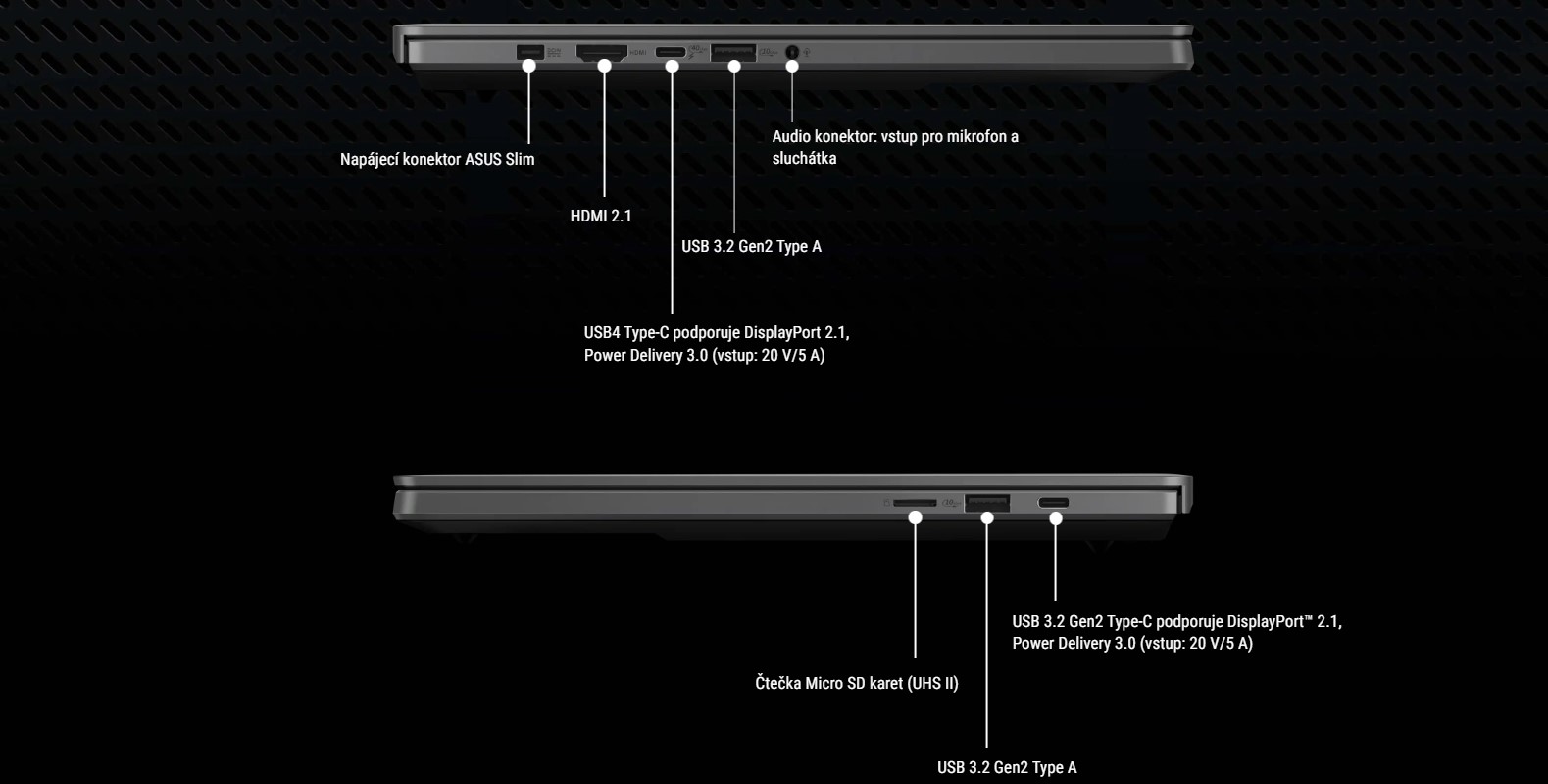 Navzdory svému štíhlému a mimořádně přenosnému tělu nabízí G14 kompletní možnosti připojení, což vám umožní pracovat nebo vytvořit bojovou stanici vašich snů. Dva porty USB-C podporující výstup pro monitor, a jeden s podporou nabíjení Power Delivery 3.0 i DisplayPort 2.1 využívají tento všestranný konektor na maximum. Díky jednomu portu na každé straně notebooku Zephyrus G14 můžete pohodlně nabíjet své zařízení bez ohledu na to, kam jste odcestovali. Pro vaše další periferní zařízení jsou k dispozici dva porty USB 3.2 Gen2 Type-A, které ještě více rozšiřují možnosti připojení. Pro rychlý přenos souborů nebo další úložiště je připravena speciální čtečka karet MicroSD UHS-II.