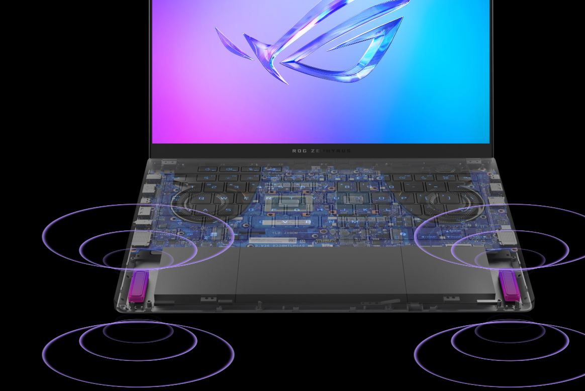 Větší někdy znamená lepší. Zephyrus G14 má oproti předchozí generaci o 125 % větší reproduktory. Tento obrovský nárůst umožňuje dosáhnout vyšší hlasitosti i čistšího a bohatšího zvuku při nižších hlasitostech. Tyto basové reproduktory jsou také schopny dosáhnout mnohem nižších frekvencí, takže basy jsou hlubší, než byste od tenkého a lehkého notebooku očekávali.
