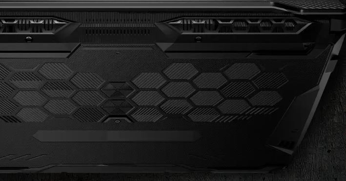 Spodní část šasi je pokryta voštinovou texturou. Strategicky umístěné otvory zároveň fungují jako průduchy chlazení.