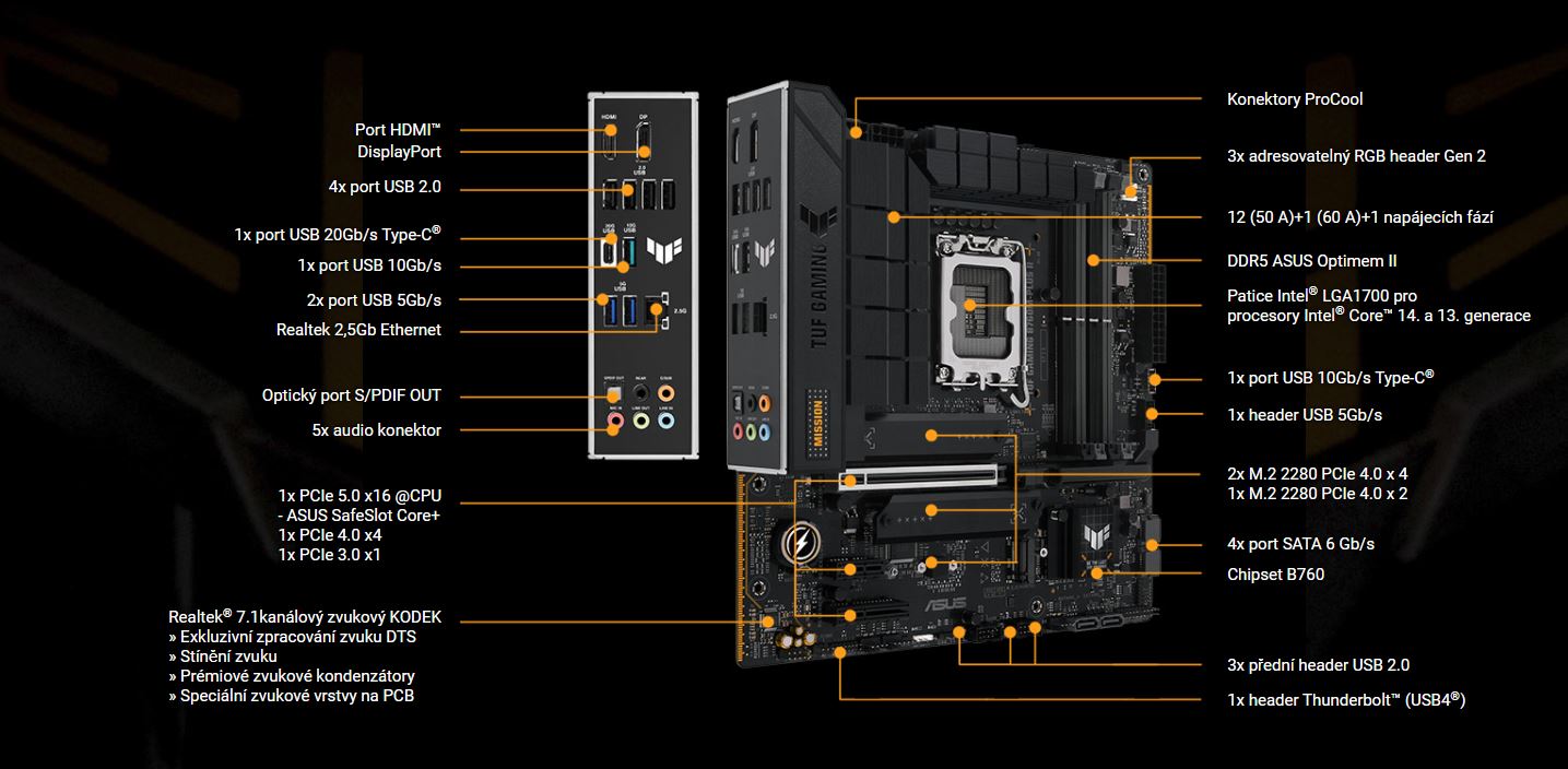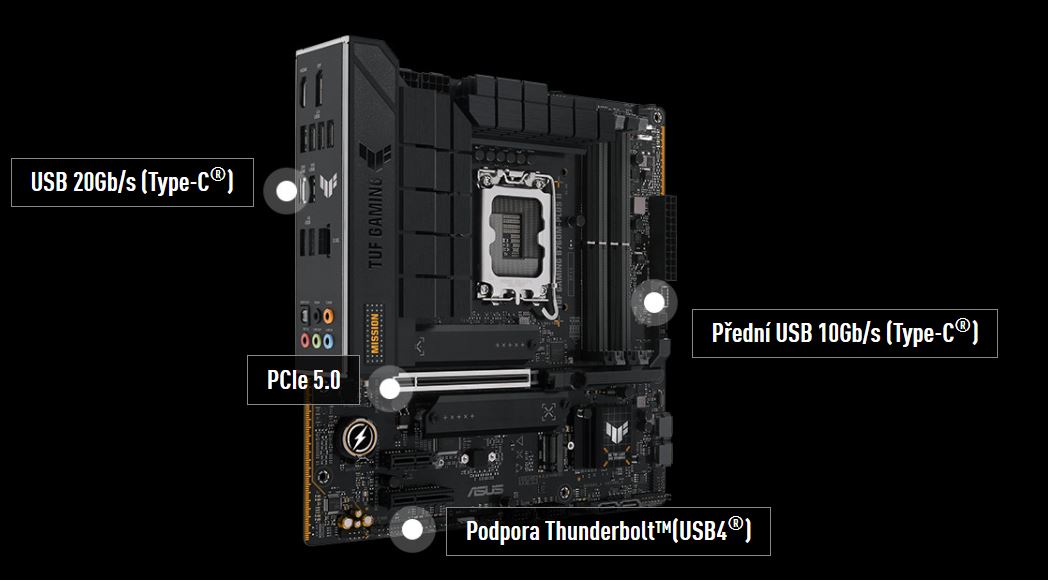 TUF-GAMING B760M-PLUS II dosahuje nových výšin výkonnostního potenciálu díky nejnovější verzi PCI Express, zatímco arzenál portů USB zahrnuje dvě připojení Type-C. Thunderbolt 4 ještě více rozšiřuje kompatibilitu a šířku pásma.