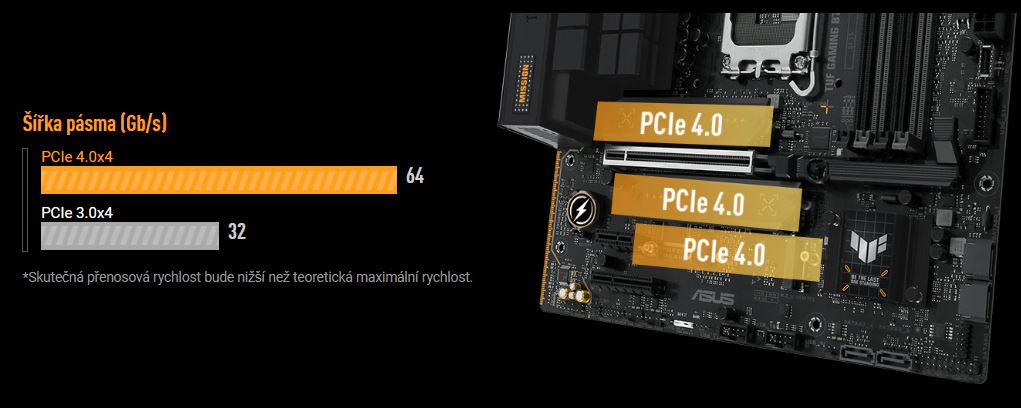 Tři sloty PCIe 4.0 M.2 podporují až tři zařízení 2280, z čehož dvě jsou schopna dosáhnout rychlosti přenosu dat až 64 Gb/s prostřednictvím rozhraní PCIe® 4.0, což umožňuje rychlejší spouštění systému a načítání aplikací na disku s operačním systémem nebo disku s aplikacemi.