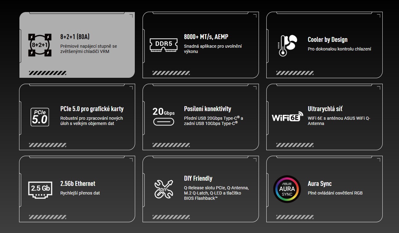 ASUS TUF GAMING B850-E WIFI využívá všechny základní prvky nejnovějších procesorů AMD Ryzen a kombinuje je s funkcemi připravenými na hry a osvědčenou odolností. Tato základní deska je vybavena komponenty vojenské kvality, vylepšeným řešením napájení a komplexním systémem chlazení, a tak překonává očekávání díky solidnímu a stabilnímu výkonu pro herní maratony. Základní desky TUF GAMING také procházejí náročným testováním odolnosti, aby bylo zajištěno, že zvládnou podmínky, ve kterých by jiné mohly selhat. Tato platforma poskytuje výkon a konektivitu, které vyžadují pokročilé aplikace pro počítače s umělou inteligencí.