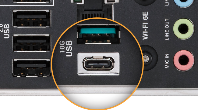 Rozsáhlá podpora USB zajišťuje připojení k široké škále externích zařízení. Tato základní deska obsahuje port USB 10Gb/s typu C na zadním panelu I/O, který poskytuje přenosovou rychlost až 10 Gb/s.
