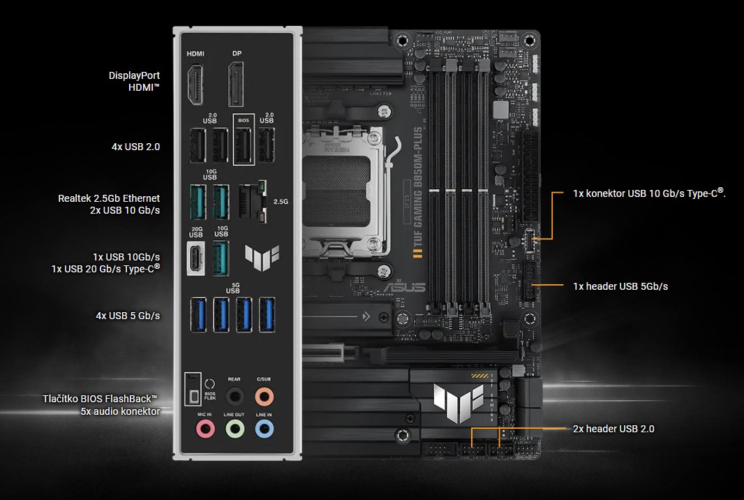 ASUS TUF GAMING B850M-PLUS využívá všechny výhody nejnovějších procesorů AMD Ryzen™ a kombinuje je s funkcemi určenými pro hraní her a osvědčenou odolností. Tato základní deska je vybavena komponenty vojenského standardu, vylepšeným řešením napájení a komplexním systémem chlazení. Překoná vaše očekávání, protože nabízí stabilní výkon během herních maratonů. Základní desky TUF GAMING navíc procházejí přísným testováním odolnosti, aby bylo zajištěno, že zvládnou podmínky, ve kterých by jiné desky mohly selhat. Tato platforma poskytuje výkon a konektivitu, které vyžadují pokročilé AI PC aplikace.