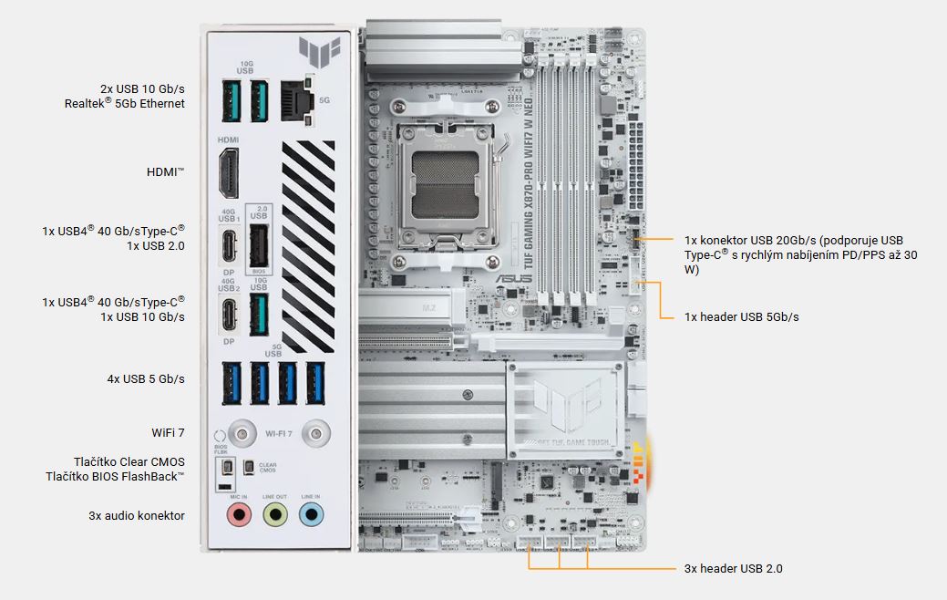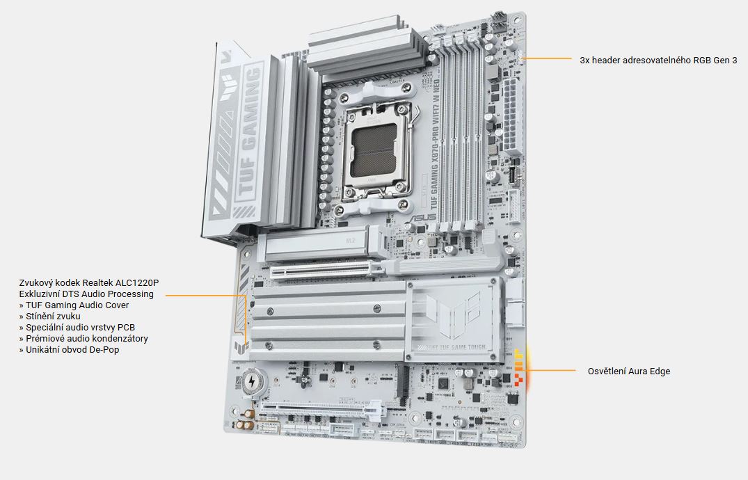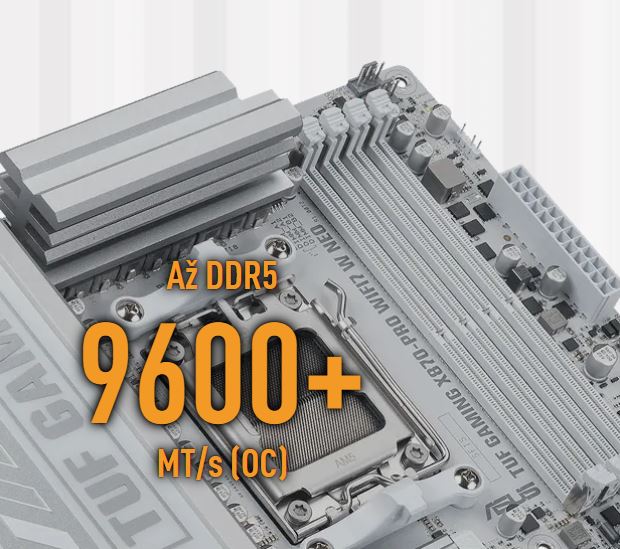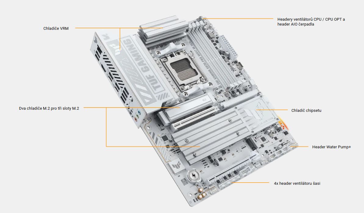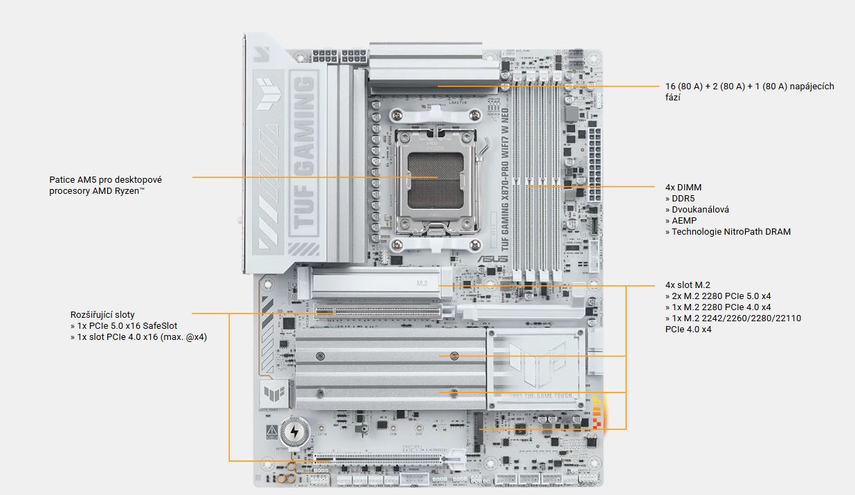 ASUS TUF GAMING X870-PRO WIFI7 W NEO využívá všechny výhody nejnovějších procesorů AMD Ryzen™ a kombinuje je s funkcemi určenými pro hraní her a osvědčenou odolností. Tato základní deska je vybavena vylepšeným řešením napájení a komplexním systémem chlazení. Překoná vaše očekávání, protože nabízí stabilní výkon během herních maratonů. Základní desky TUF GAMING navíc procházejí přísným testováním odolnosti, aby bylo zajištěno, že zvládnou podmínky, ve kterých by jiné desky mohly selhat. Tato platforma poskytuje výkon a konektivitu, které vyžadují pokročilé AI PC aplikace.