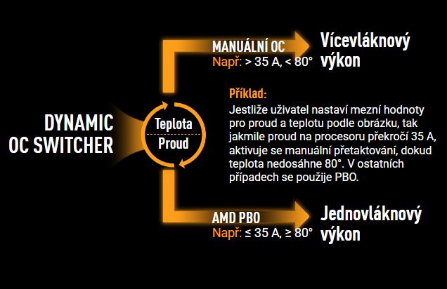 Dynamic OC Switcher maximalizuje výkon procesoru, protože umožňuje nastavit mezní hodnoty proudu a teploty pro automatické přepínání mezi manuálním taktováním pro náročné vícevláknové úlohy a Precision Boost Overdrive pro jednovláknové úlohy. Nejnovější Overclocking Load Guard má vylepšený mechanismus okamžité ochrany před proudem, který zabraňuje pádům systému během přetaktování.