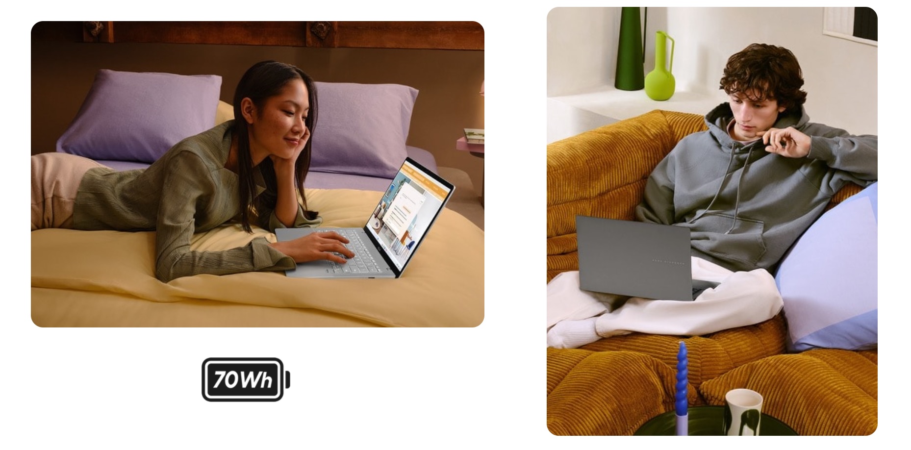 S notebookem ASUS Vivobook S14 se nemusíte bát, že se vám vybije baterie! Jeho 70Wh vysokokapacitní baterie nabízí celodenní výdrž pro bezproblémový multitasking a zábavu. Postará se o to, aby měl váš notebook dostatek energie a byl připraven od úsvitu do soumraku na cokoli.