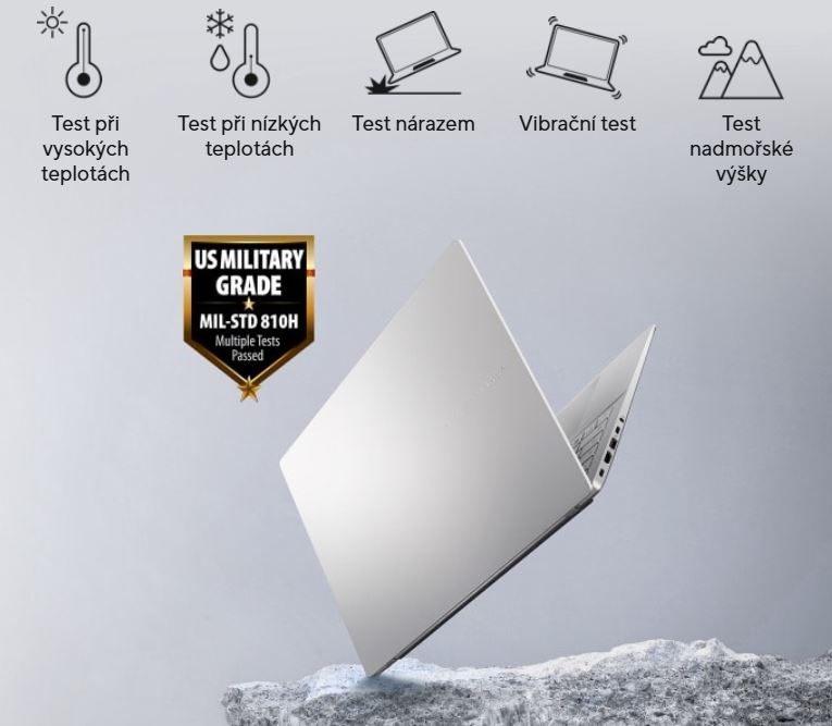 Spotřebitelské notebooky ASUS splňují mimořádně náročný vojenský standard MIL-STD 810H, který garantuje spolehlivost a odolnost. Procházejí náročným testovacím režimem, který zahrnuje rozšířené testy pro provoz v extrémních podmínkách. Tyto faktory také prospívají dlouhé životnosti notebooků, a tím i udržitelnosti, takže můžete pracovat, cestovat nebo odpočívat s jistotou, že váš notebook ASUS je připraven na skutečný svět - dnes i v dalších letech.