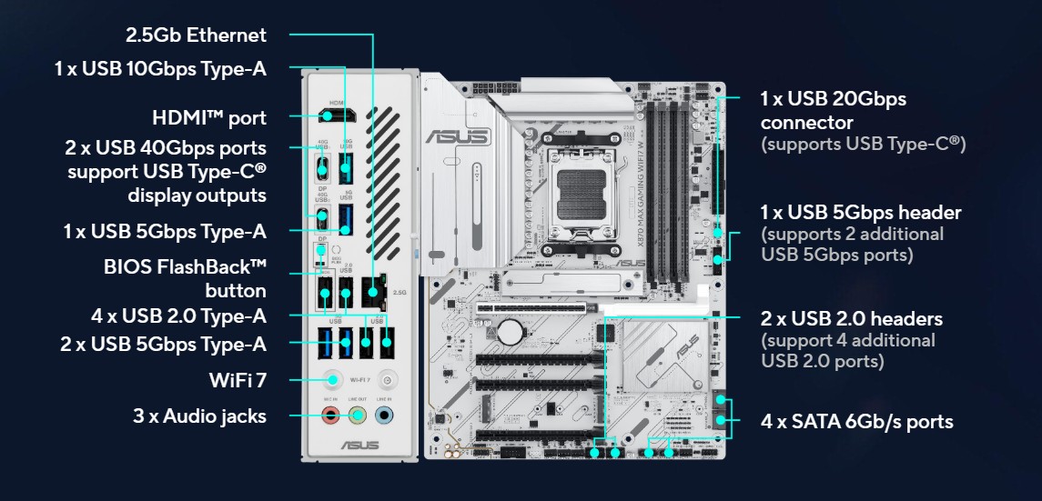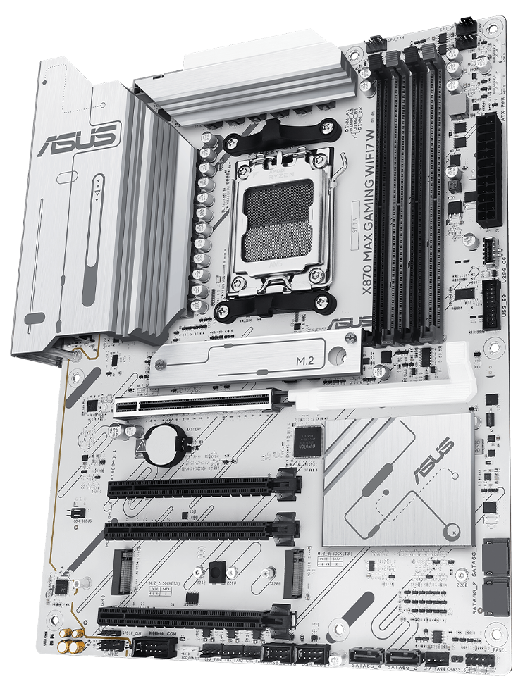 Základní desky ASUS řady X870 jsou odborně navrženy tak, aby naplno využily potenciál procesorů AMD Ryzen™ řady 9000. Základní deska X870 MAX GAMING WIFI7 W, která se může pochlubit robustní konstrukcí napájení, komplexním řešením chlazení a inteligentními možnostmi ladění, poskytuje uživatelům a stavitelům počítačů pro kutily řadu optimalizací výkonu prostřednictvím intuitivních funkcí softwaru a firmwaru. Je navržena tak, aby byla připravena pro pokročilé počítače s umělou inteligencí a nabízela výkon a konektivitu potřebnou pro náročné aplikace s umělou inteligencí.