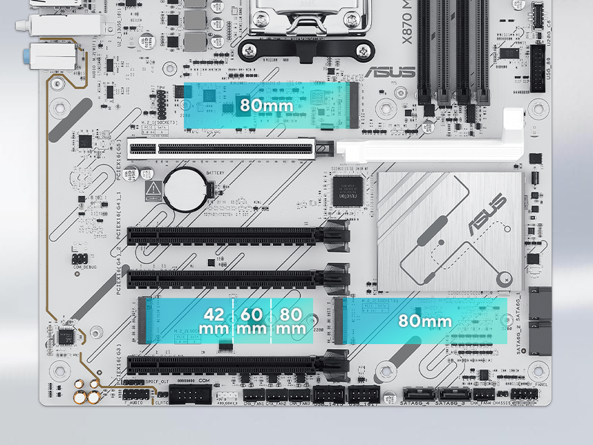 X870 MAX GAMING WIFI7 W nabízí celkem tři sloty M.2, z nichž jeden podporuje přenos dat rychlostí až 128 Gb/s prostřednictvím PCIe 5.0 a dva 64 Gb/s prostřednictvím PCIe 4.0. To umožňuje rychlejší spouštění a načítání aplikací s operačním systémem nebo aplikačními drivery.