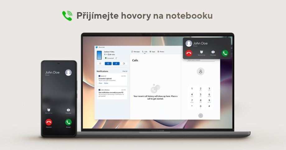 Jednoduše přijímejte hovory, spravujte oznámení a přenášejte soubory přímo z jediného zařízení, vašeho Zenbooku A14. Telefon můžete snadno používat jako webovou kameru.