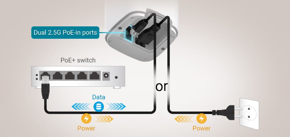 BD4 Outdoor podporuje jak PoE+ (Power over Ethernet, IEEE 802.3at), tak napájení z elektrické sítě (AC), což umožňuje flexibilní a snadnou instalaci v mnoha prostředích. Je vybaven dvěma 2,5G PoE+ ethernetovými porty s automatickou detekcí WAN, díky čemuž automaticky rozpozná typ připojení. Vyhrazený port WAN podporuje funkci PoE-IN. Tato flexibilita typu plug-and-play zajišťuje optimální pohodlí a výkon pro jakékoli venkovní využití.