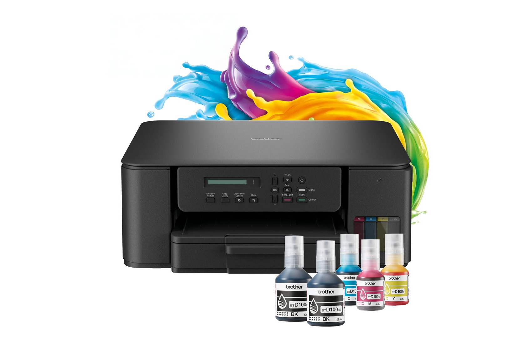 Kompaktní tiskárna DCP-T530DW s inkoustovými nádržkami 3 v 1 tiskne déle díky lahvičkám s vysokou výtěžností. Doplňte nádržky rychle a bez držení lahviček – inovativní zámkový systém s klíčem zabrání záměně barev a zajistí správné doplnění.